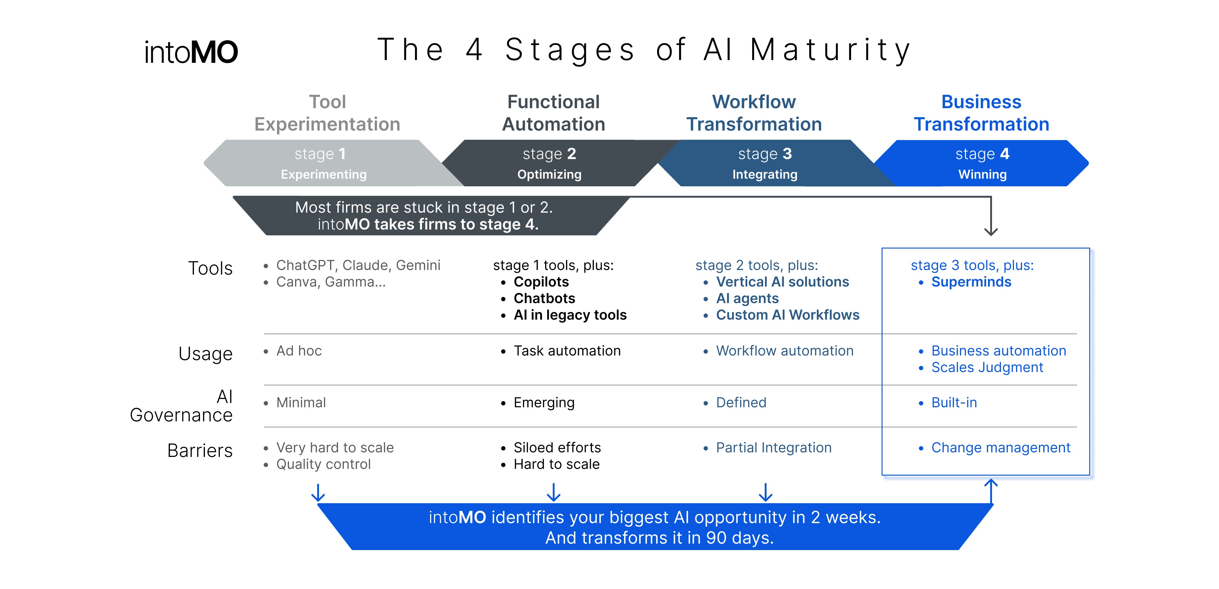 Is your firm winning the AI adoption race? If you're stuck in stage 1 or 2, intoMO can help.